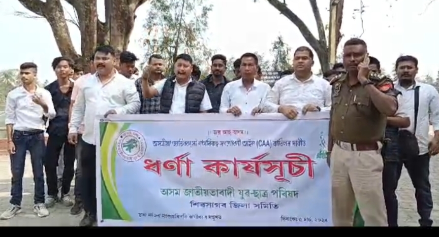 দিলিপ হাজৰিকা, ৫ ফ্ৰেব্ৰুৱাৰী,২০২৪ : কা'(CAA) বিৰোধী প্ৰতিবাদেৰে পুনৰ উত্তাল হ’ল নাজিৰা মহকুমাধিপতি কাৰ্যালয়ৰ চৌহদ। “কা”ৰ বিৰোধীতাৰে নাজিৰা মহকুমাধিপতি কাৰ্যালয়ৰ সন্মুখত আজি ধৰ্ণা কাৰ্য্যসূচী ৰূপায়ন কৰে অসম জাতীয়তাবাদী যুৱ ছাত্ৰ পৰিষদ শিৱসাগৰ জিলা সমিতিয়ে।